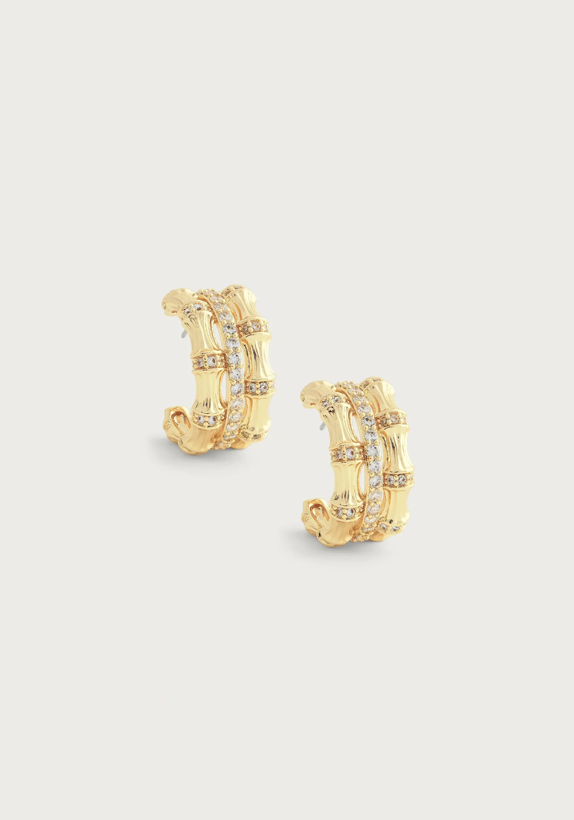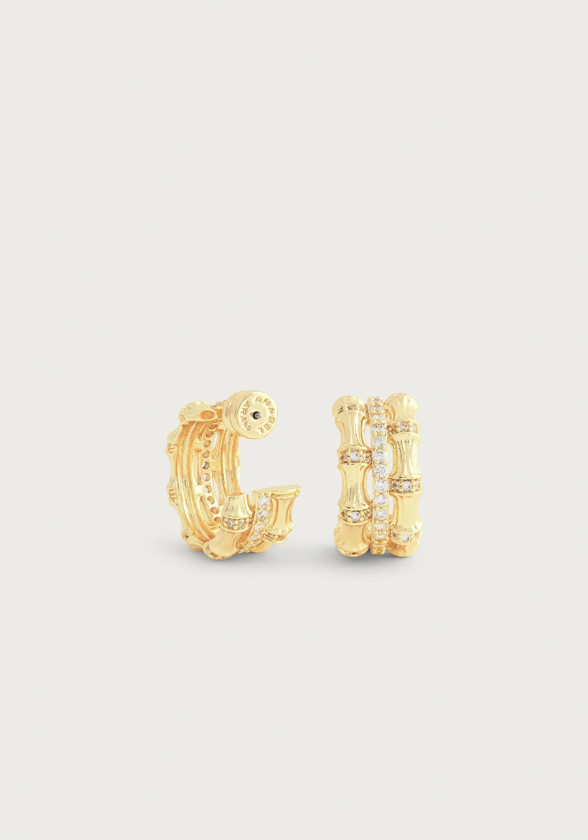 These earrings feature our best selling Bamboo Stacked Ring but in a timeless mini hoop. These 18k gold dipped pieces, with their exquisitely textured surfaces, are a captivating classic and a wardrobe staple. A stunning blend of nature and art, these hoops are the perfect statement piece for any outfit. Dress up any look with these 18k gold dipped beauties.