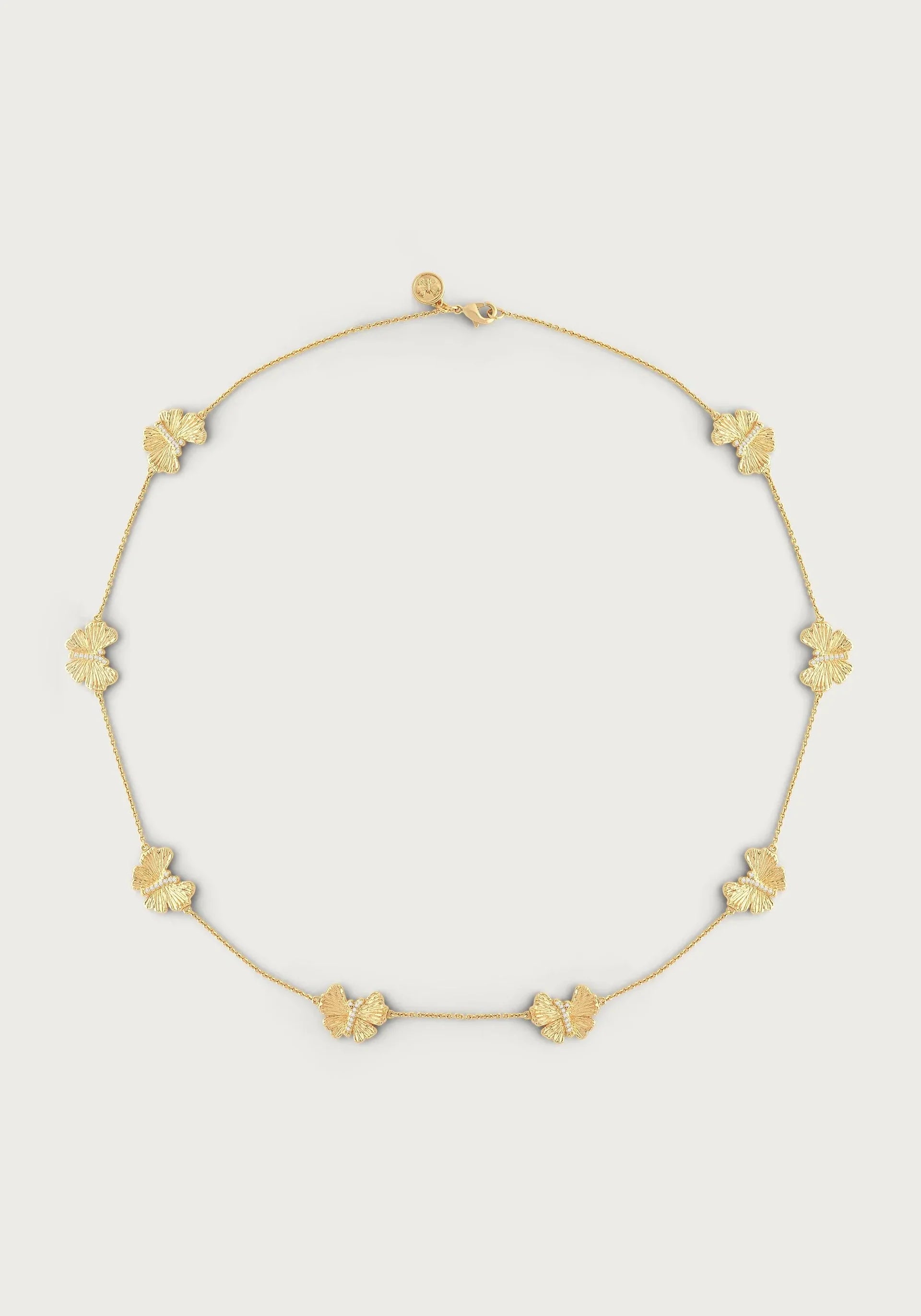 The Gold station necklace’s butterflies are hand sculpted and crafted in 18k gold dipped brass and are each accented with hand set crystals. This beautiful and exquisitely made necklace is a timeless favorite. Indulge in the elegance of our Butterfly Station Necklace, adorned with meticulously hand-sculpted butterflies crafted in gorgeous 18k gold dipped brass and embellished with sparkling hand-set crystals. With its timeless allure, this exquisitely made necklace is sure to become a cherished staple in your collection.