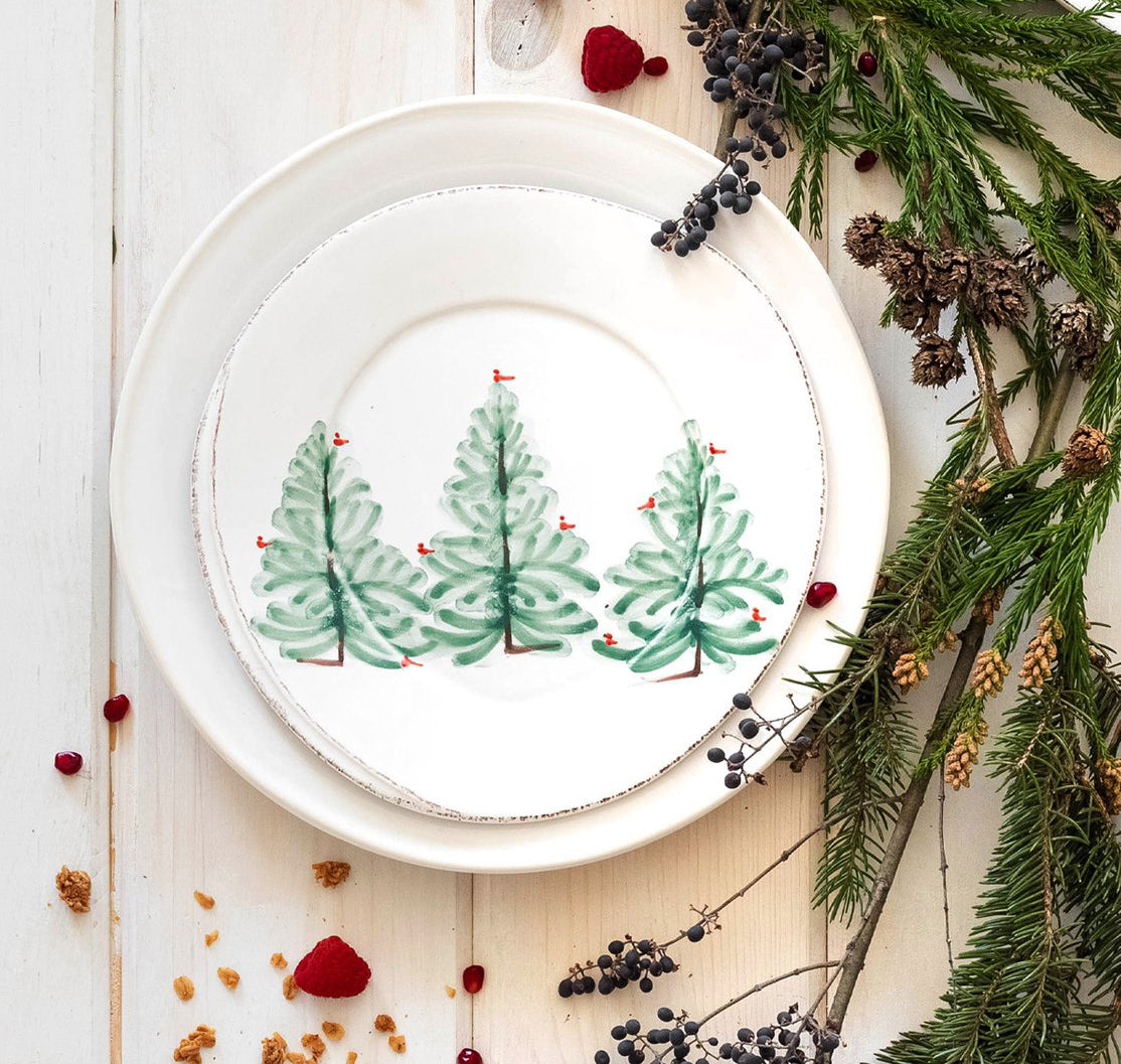 Delight in the holiday magic as handpainted fir trees and bright cardinals drift across the fresh white canvas of the Lastra Holiday Salad Plate. Mix and match with the Lastra collection for a fun and sophisticated holiday table. Handpainted on Italian stoneware in Tuscany.