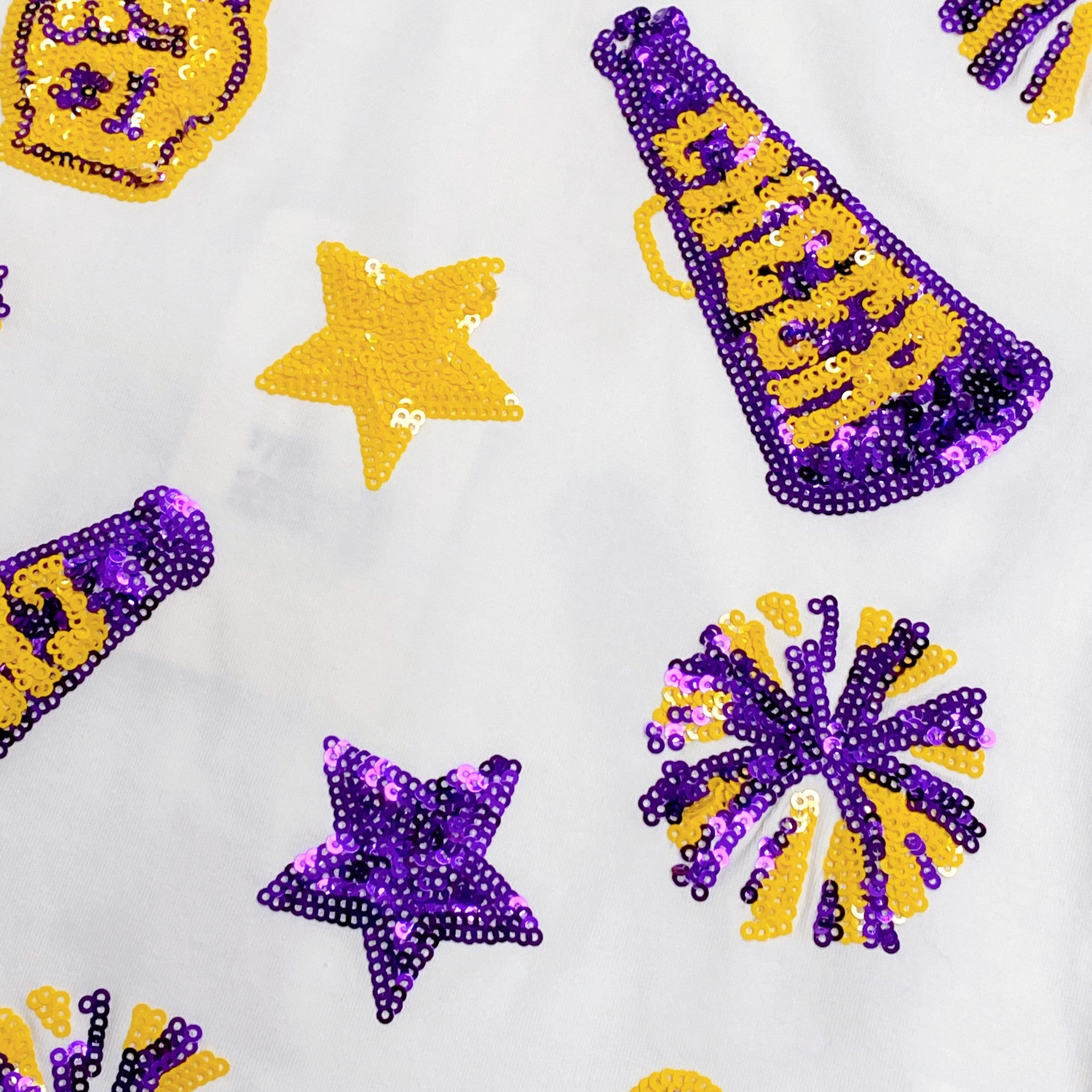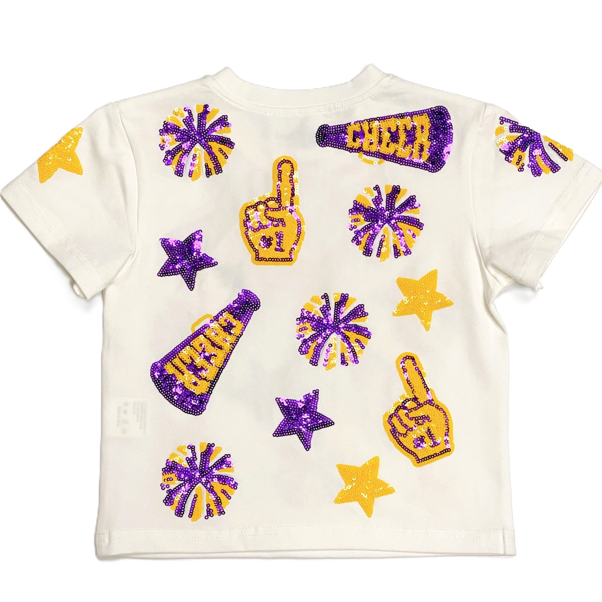 Girls Gameday Tee | Sequin Purple and Gold Cheer | Sequin Front and Back | Kids