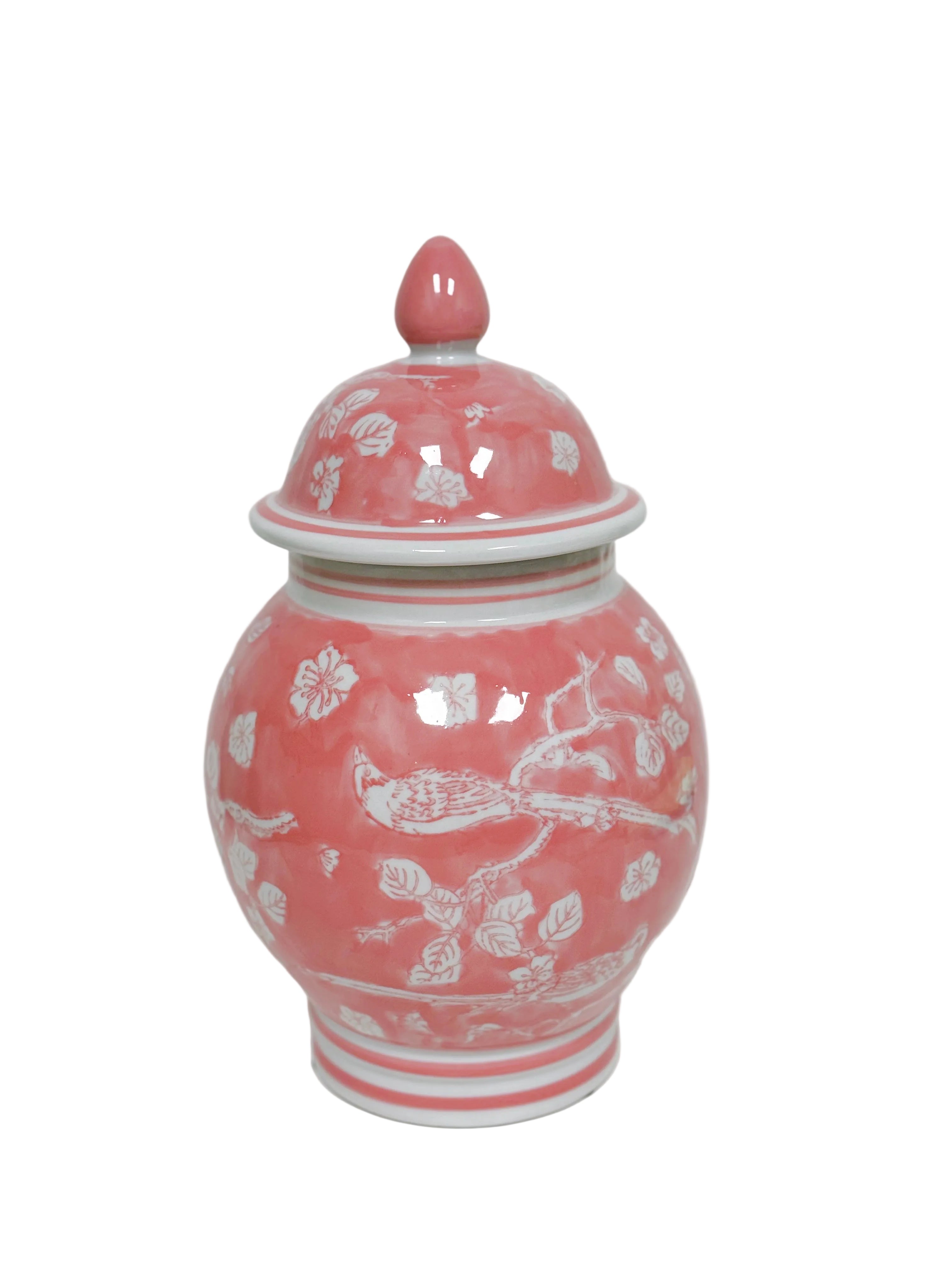 Transform your mantel or console table into a visual masterpiece with our pink chinoiserie jar. These exquisite ceramic jars, meticulously hand-painted by skilled artisans, bring a touch of elegance to any space. The soft pink hue adds a subtle pop of color while the intricate chinoiserie design offers a timeless appeal.