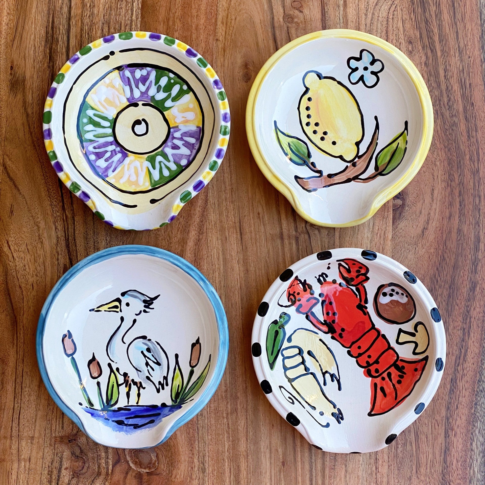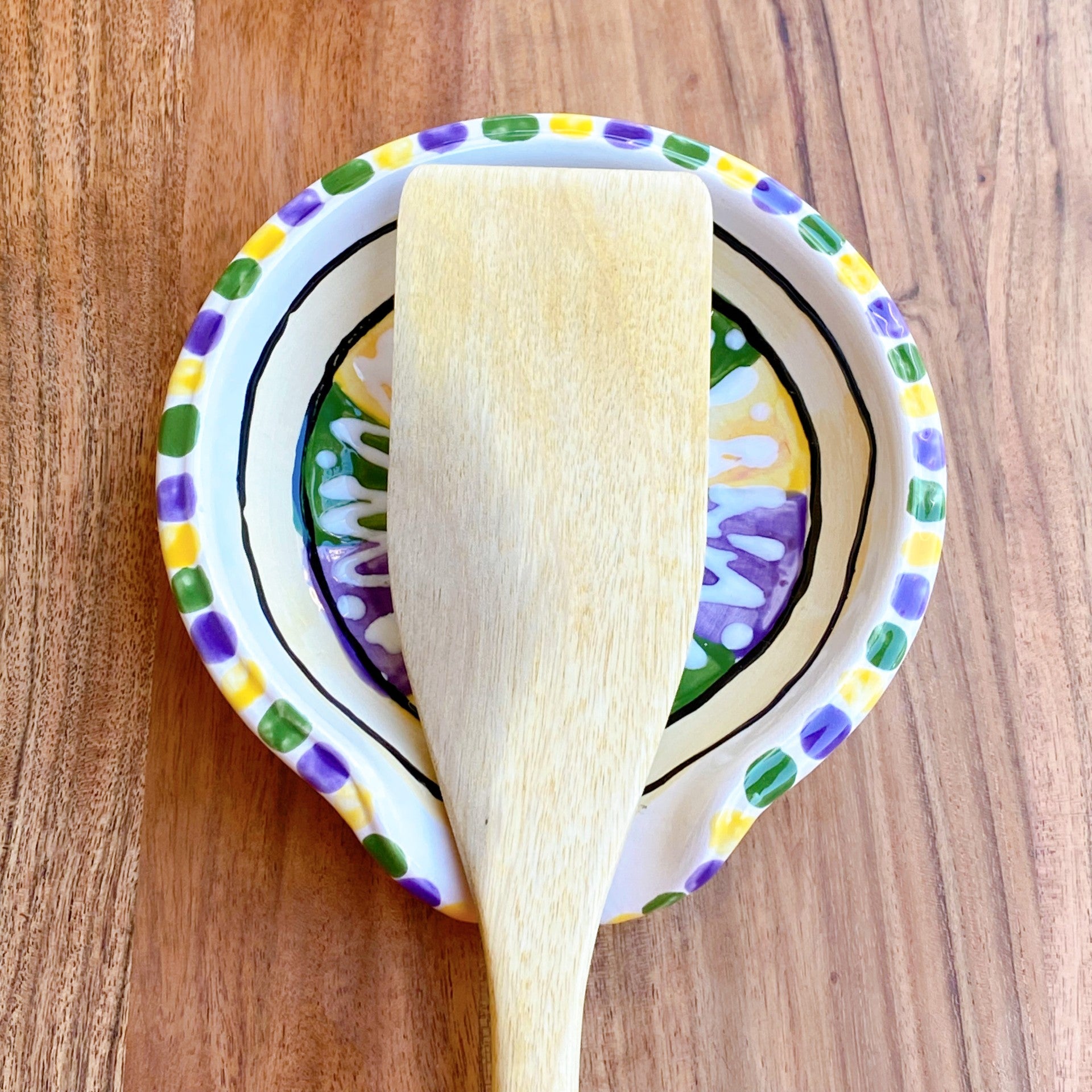 Elevate your kitchen decor with our handmade ceramic spoon rest, featuring a beautifully painted king cake design that captures the essence of Louisiana love. Perfect for adding a touch of Southern charm to your cooking space!