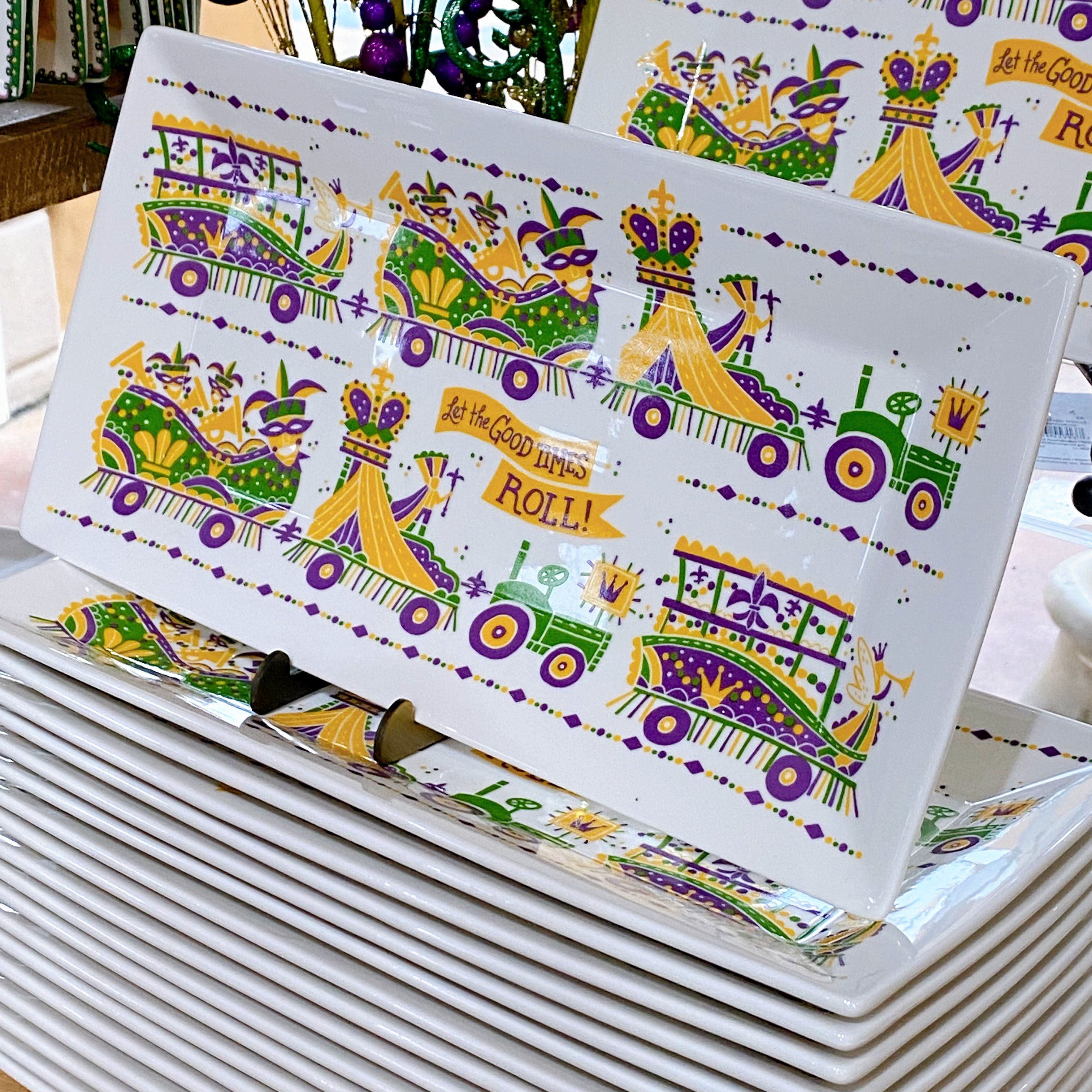 A ceramic platter featuring our new Let the Good Times Roll design by artist, Denise Gallagher. As the parades roll your customers will be serving up goodies on this platter featuring Mardi Gras floats.