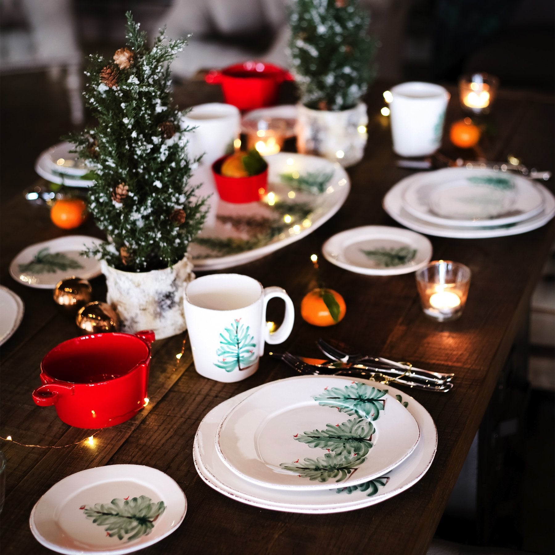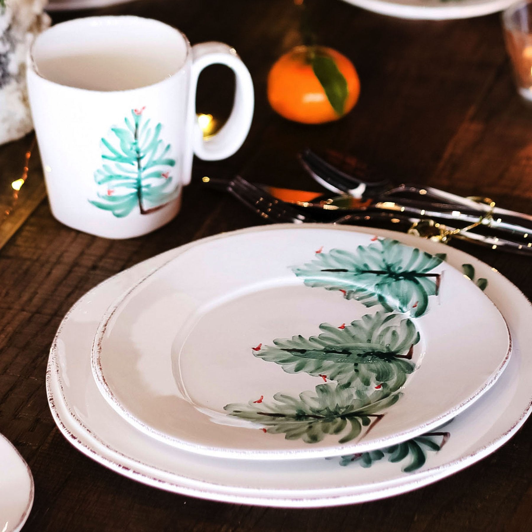 Delight in the holiday magic as handpainted fir trees and bright cardinals drift across the fresh white canvas of the Lastra Holiday Salad Plate. Mix and match with the Lastra collection for a fun and sophisticated holiday table. Handpainted on Italian stoneware in Tuscany.