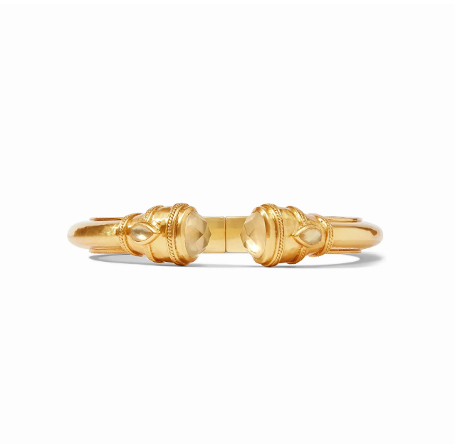 This sumptuous cuff features gemstone endcaps and two more pear-shaped gemstones set in a luxuriously gilded shank.