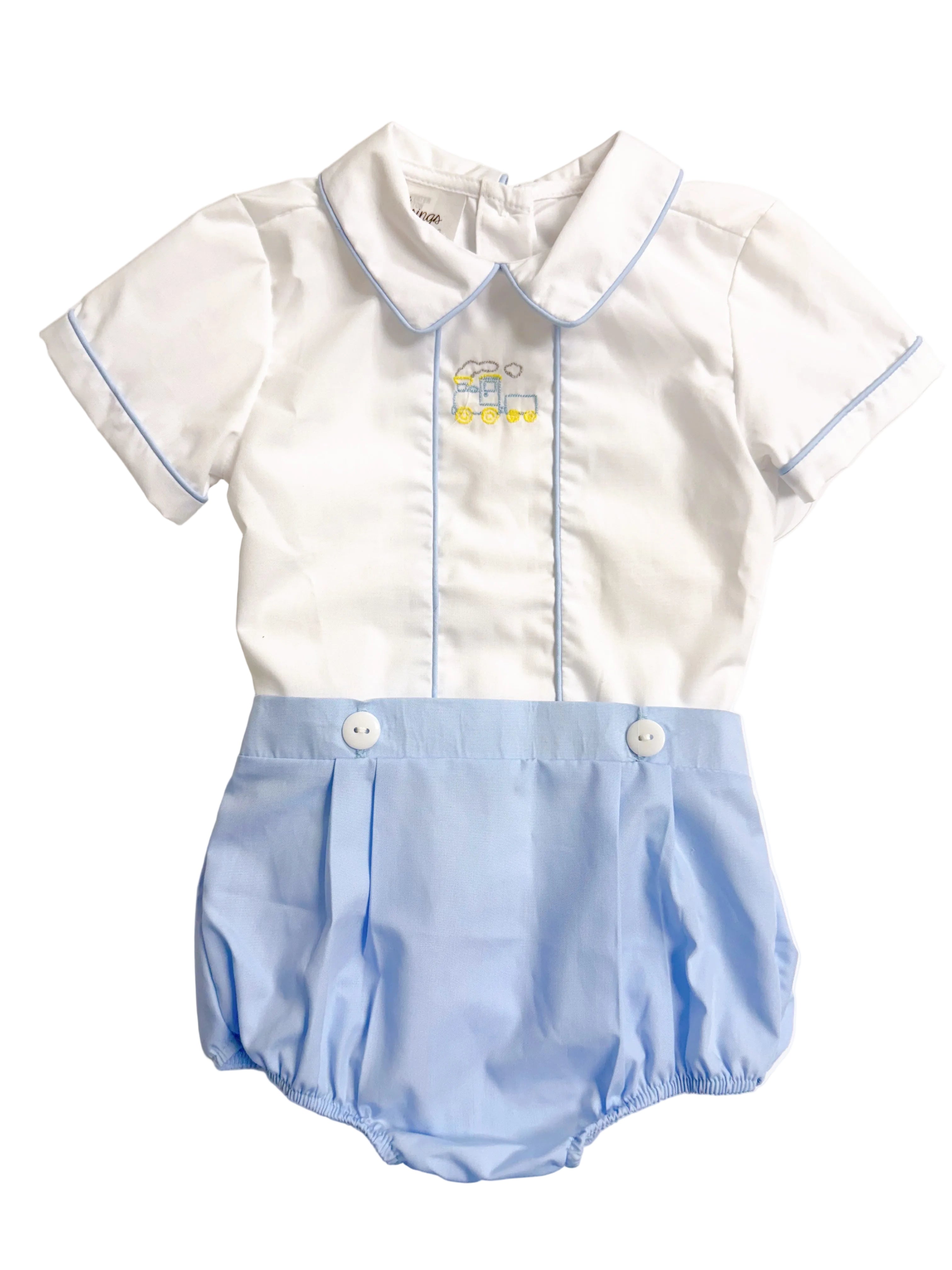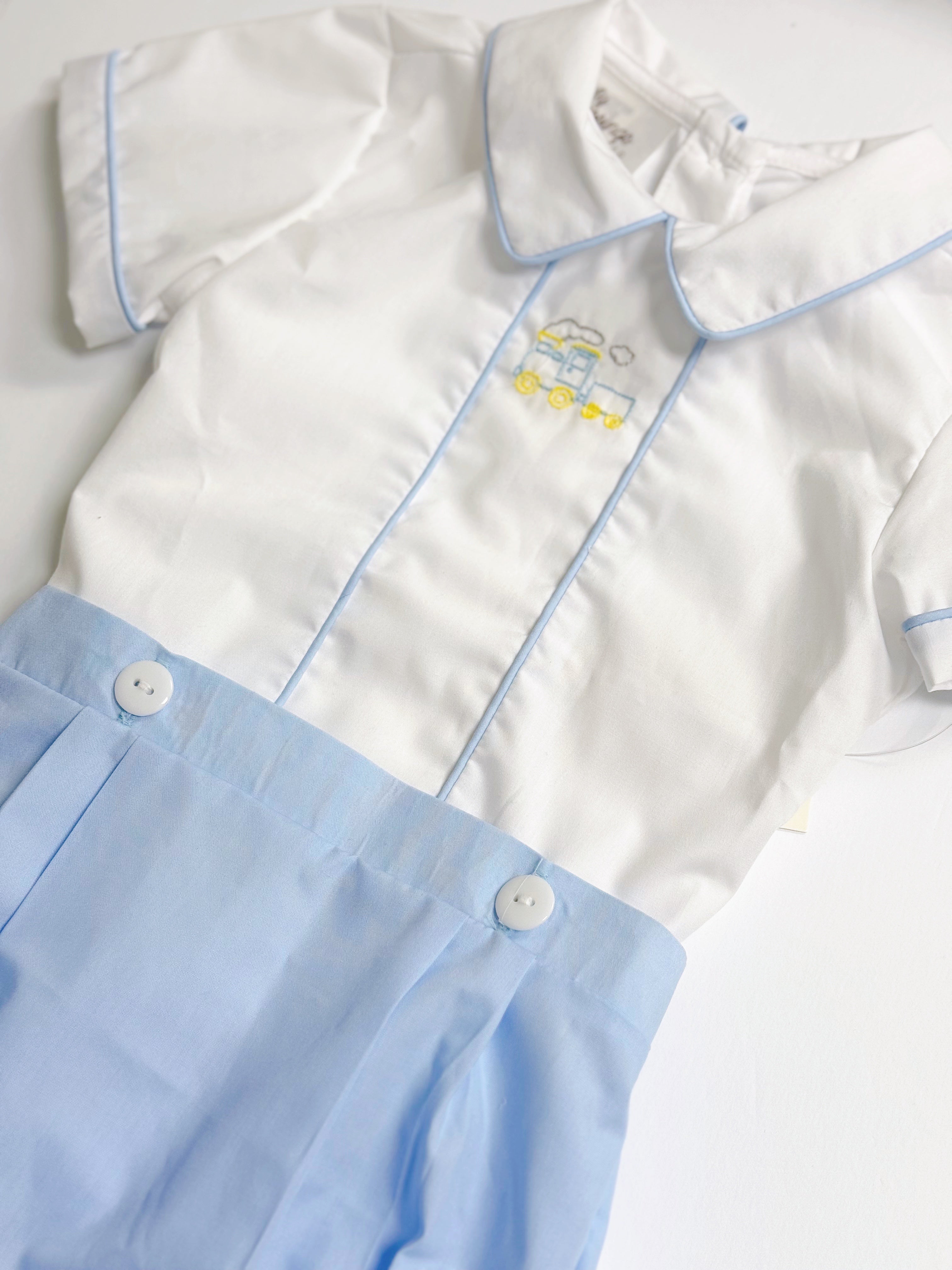 The sweetest collared outfit with a dainty train embroidery detail and button on shorts!