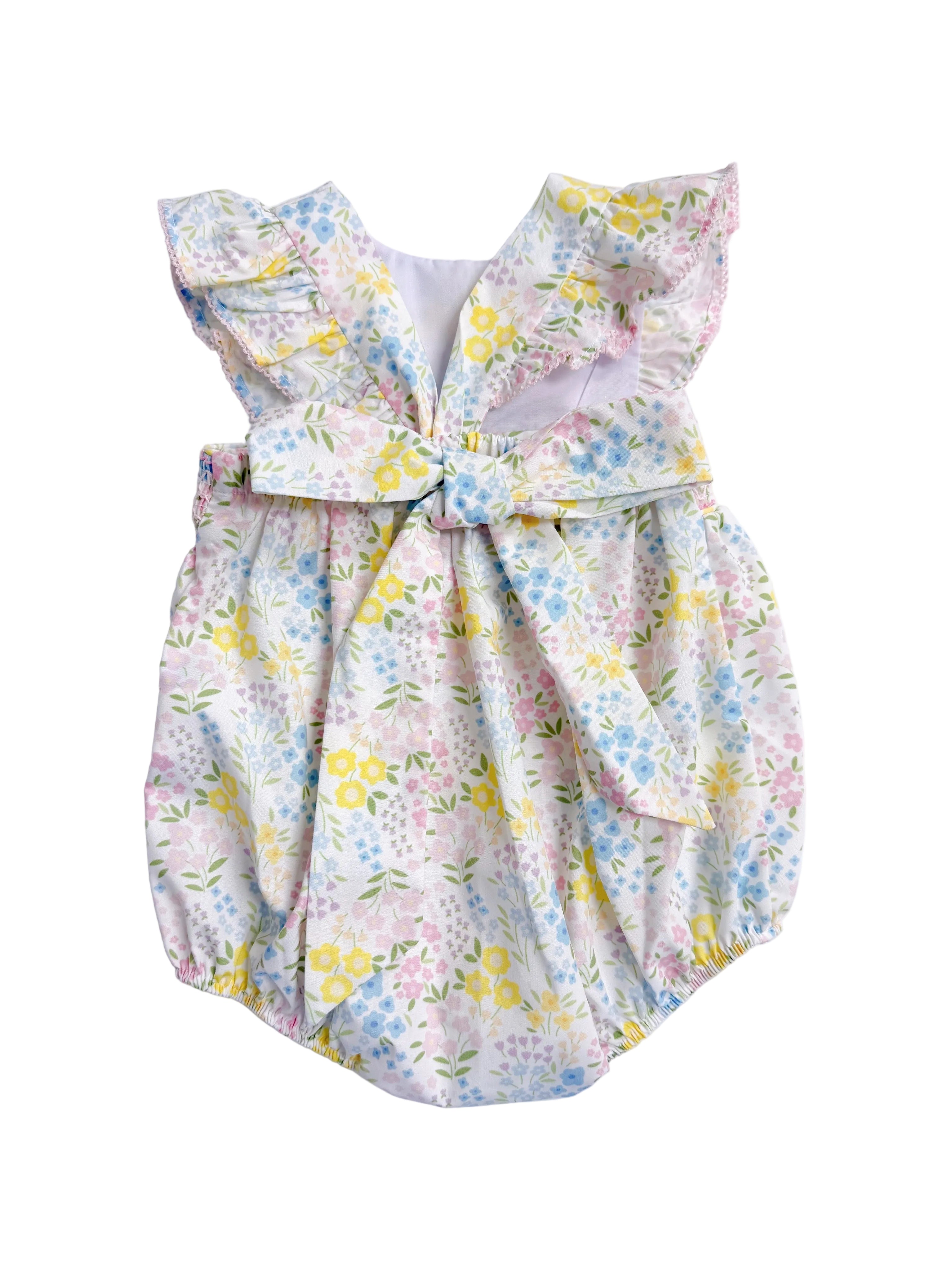 Baby Girl Spring Bouquet Smocked Bubble with a tie bow on the back