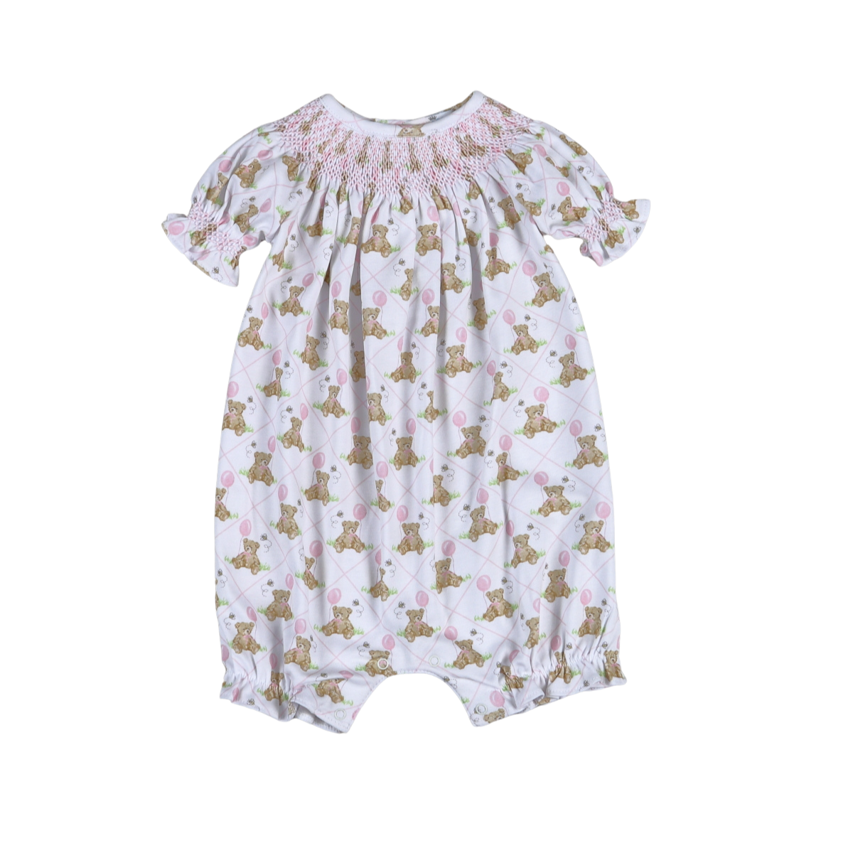 Baby girl smocked bishop bubble in a pink teddy bear print