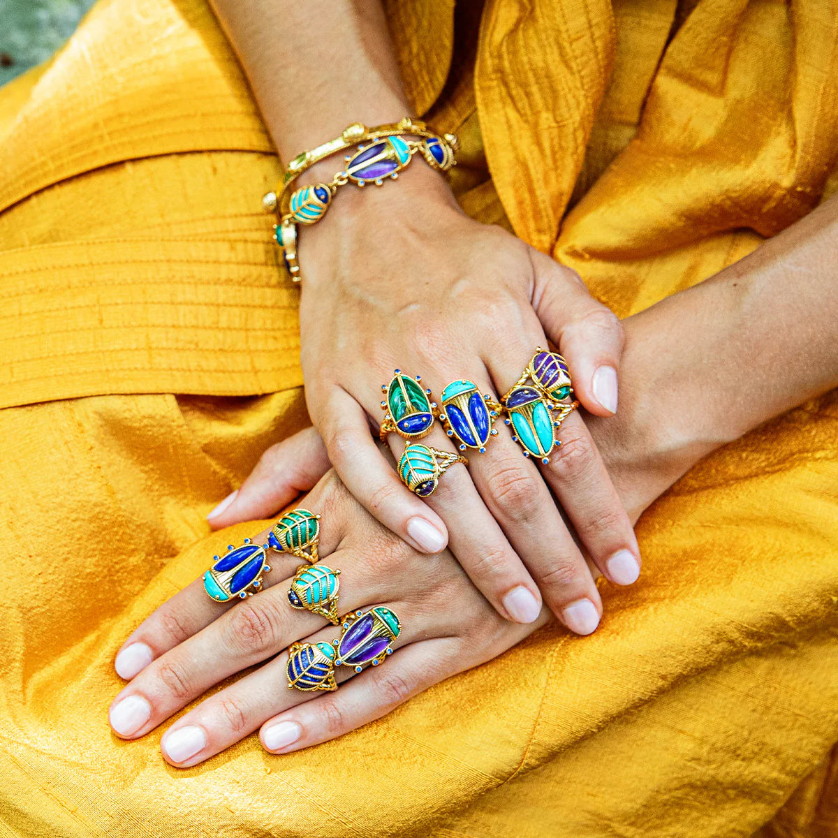 This colorful little character is an empowering talisman of resilience to carry with you every day. Our version of an ancient Egyptian amulet, this sacred scarab features polished lapis wings clad in an ornate, gilded exoskeleton with a turquoise head atop a flash gold-plated brass ring band.