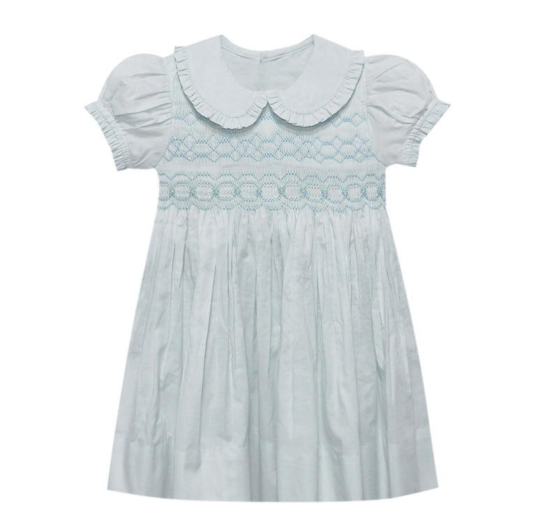 The sweetest smocked dress with a ruffled peter pan collar and tie back bow