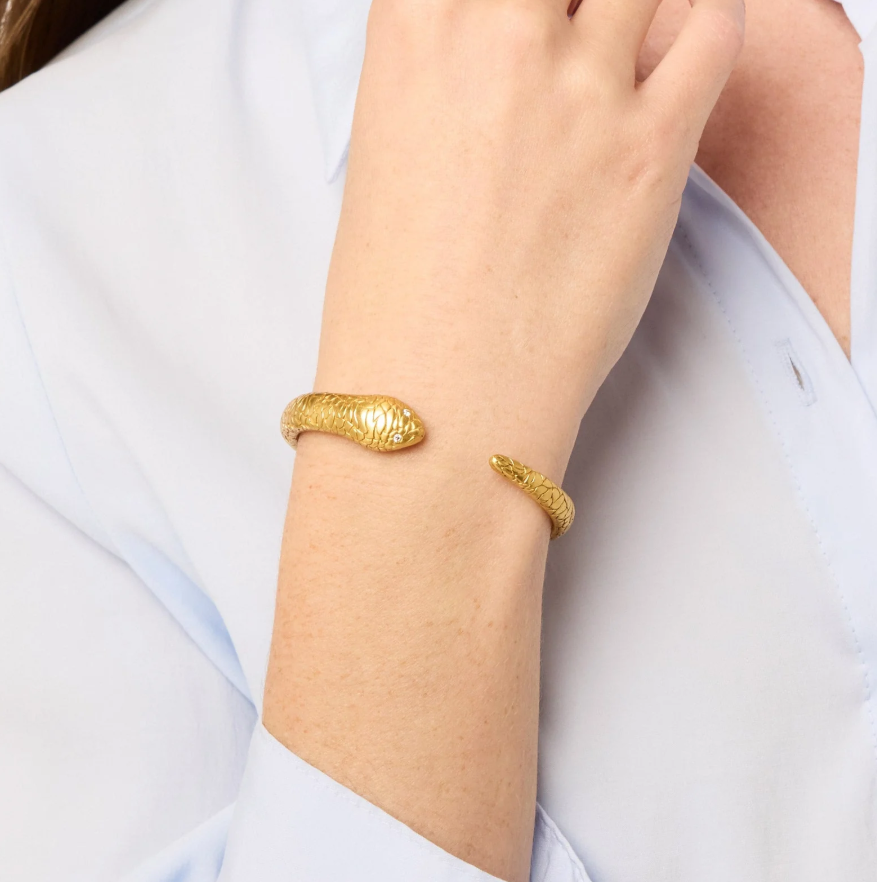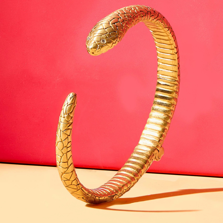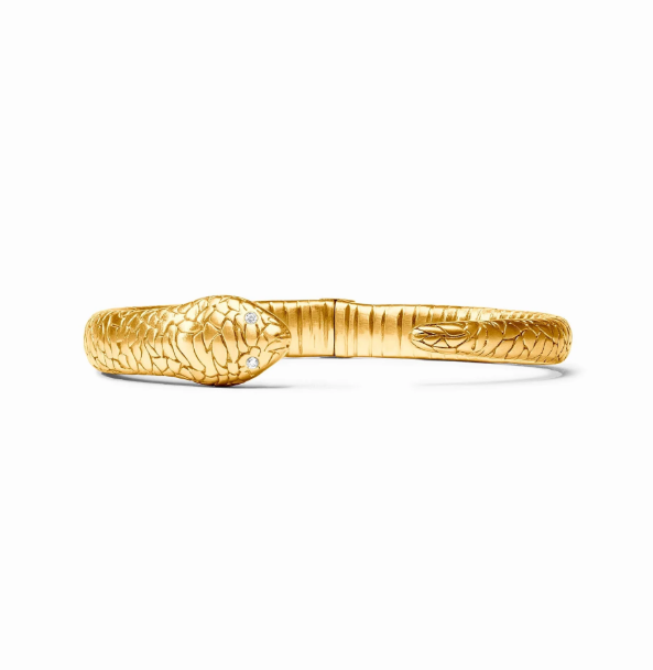 Lithe, lifelike, and luxurious, this golden serpent cuff shimmers in the sunlight, with abstract geometric scales and glittering gemstone eyes.