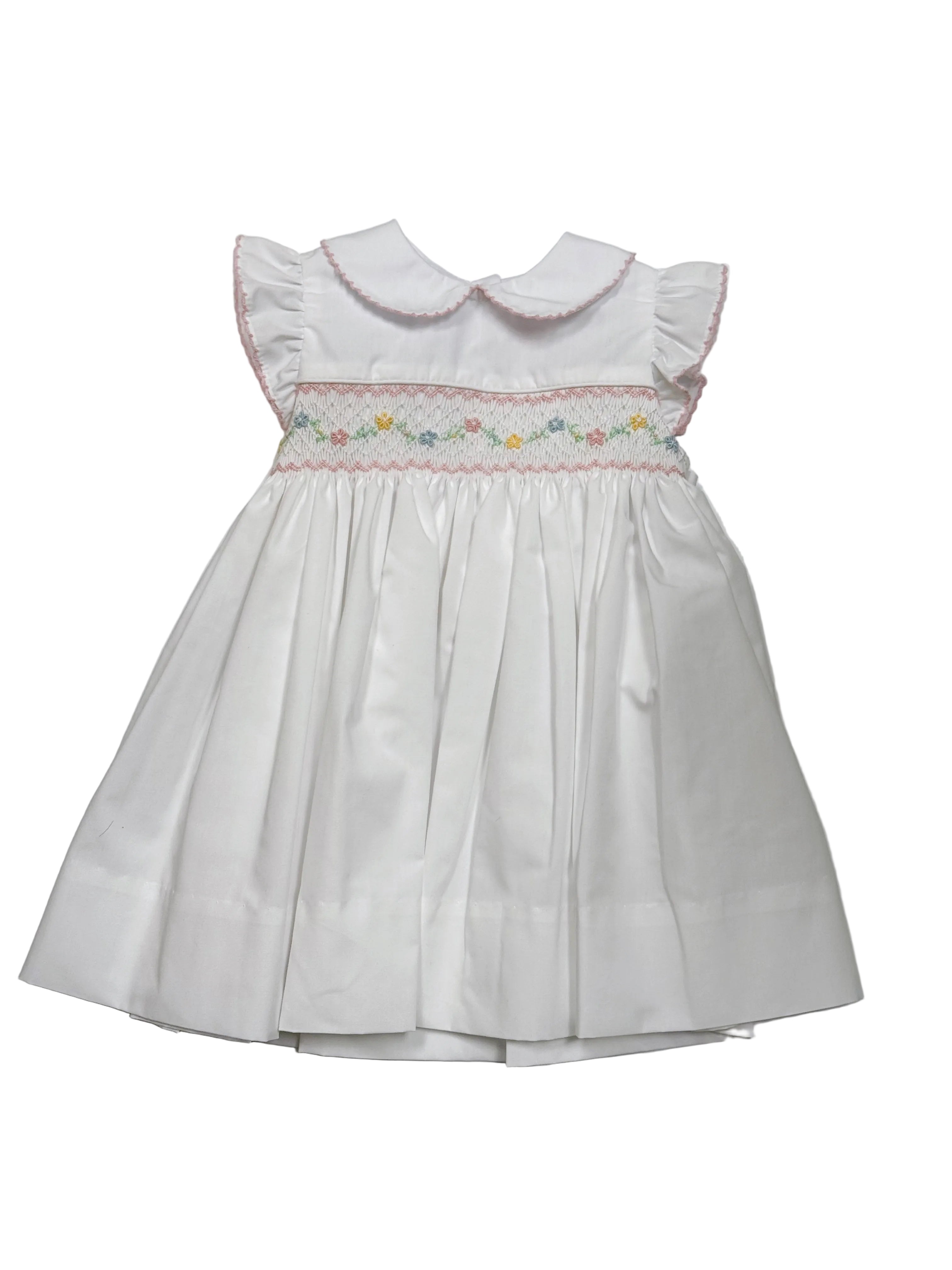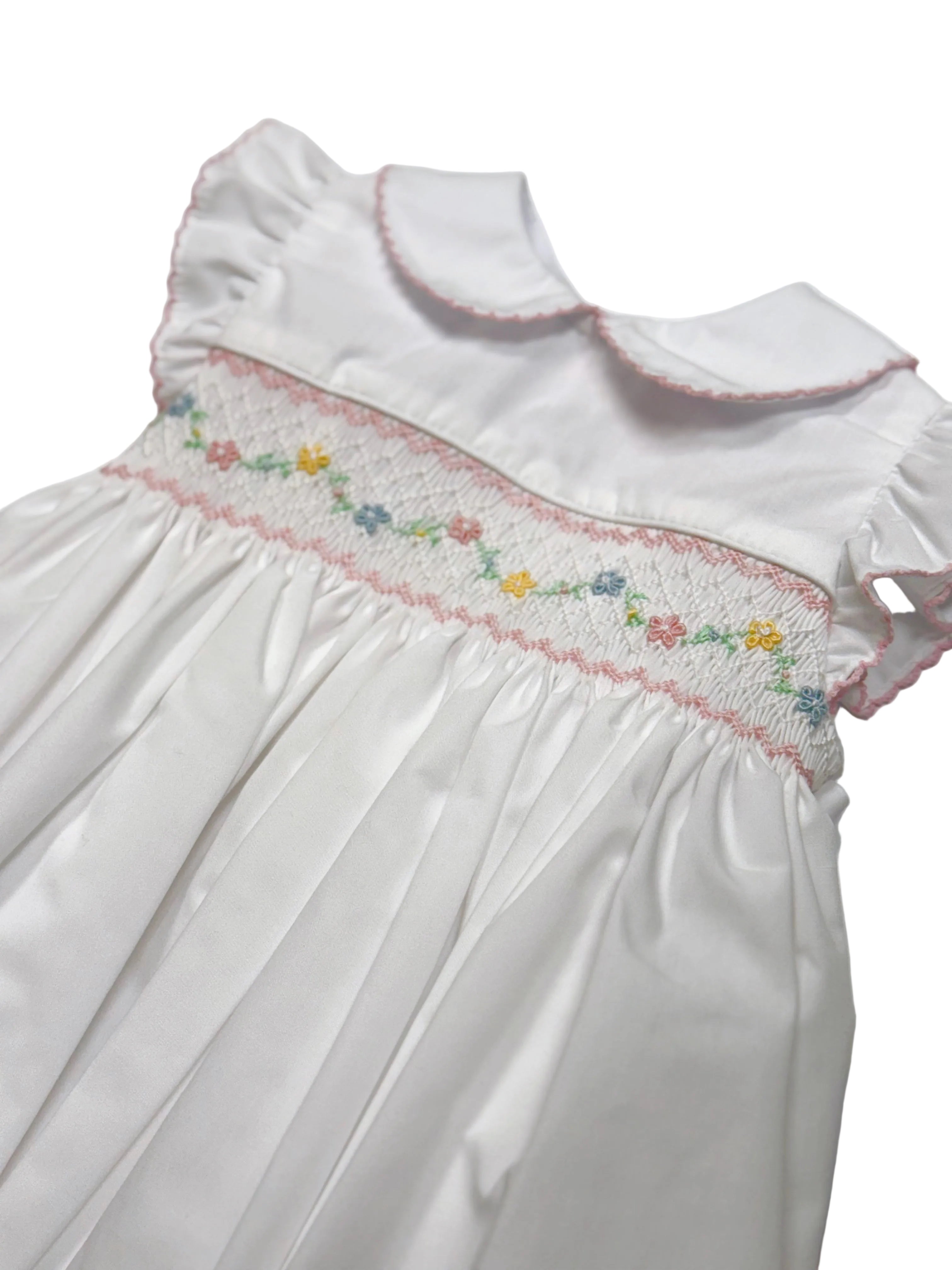 A peterpan collared dress with a floral smocked detail