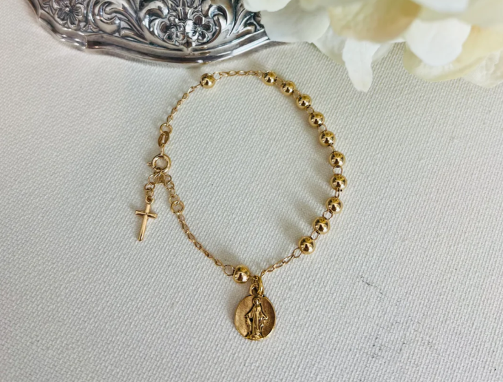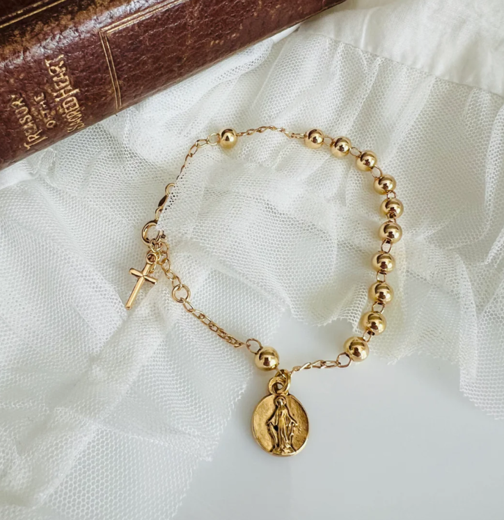 This is a lovely styling of the decade rosary bead bracelet with a Miraculous Mary medallion and cross accent. It is a wonderful reminder of the power of the rosary.