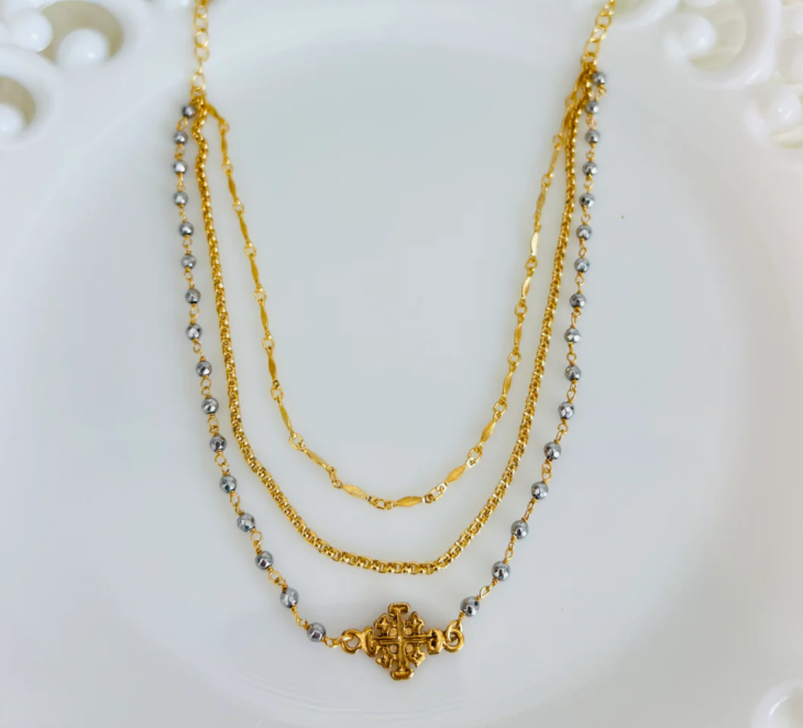 A multi strand in 1 necklace is a beautiful setting for this heirloom Jerusalem cross. The necklace is handcrafted with strands of pyrite and 14K gold plated chain. The necklace measures 16 1/2" extending to 18 1/2". Each necklace comes with a gift card that reads, "Reinvented Vintage Medallions inspire beautiful jewelry, continuing God's love and grace as the jewelry travels."