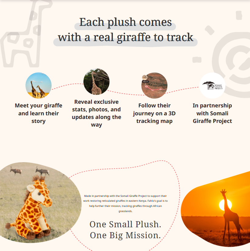 Track a real giraffe and hug this one! Created in partnership with Somali Giraffe Project, each giraffe plush unlocks an interactive tracking map and helps Fahlo support their conservation.