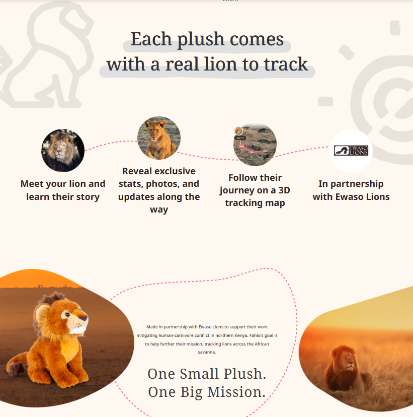 Track a real lion and bring this one home to your pride! Created in partnership with Ewaso Lions, each lion plush unlocks an interactive tracking map and helps Fahlo support their conservation.