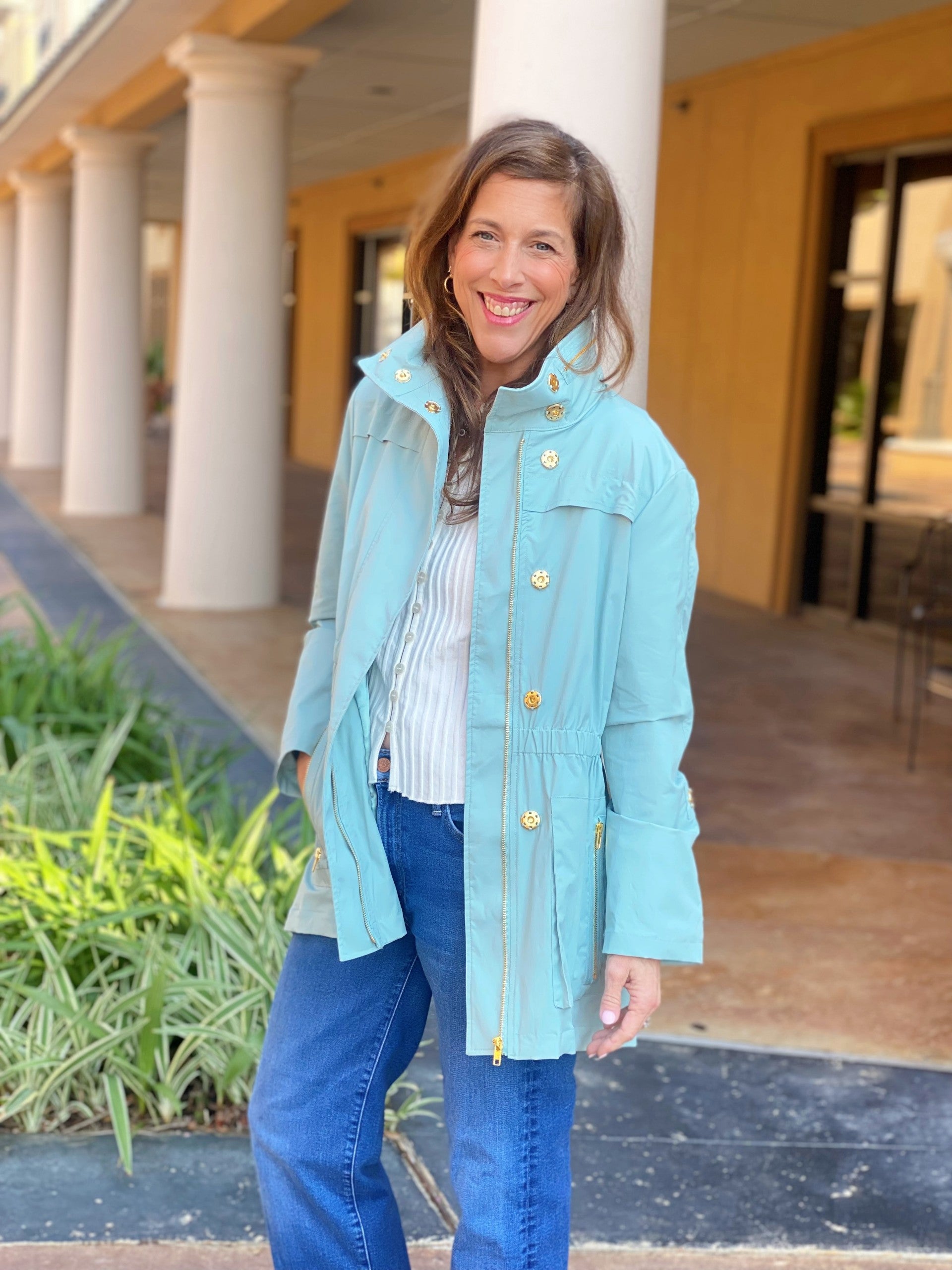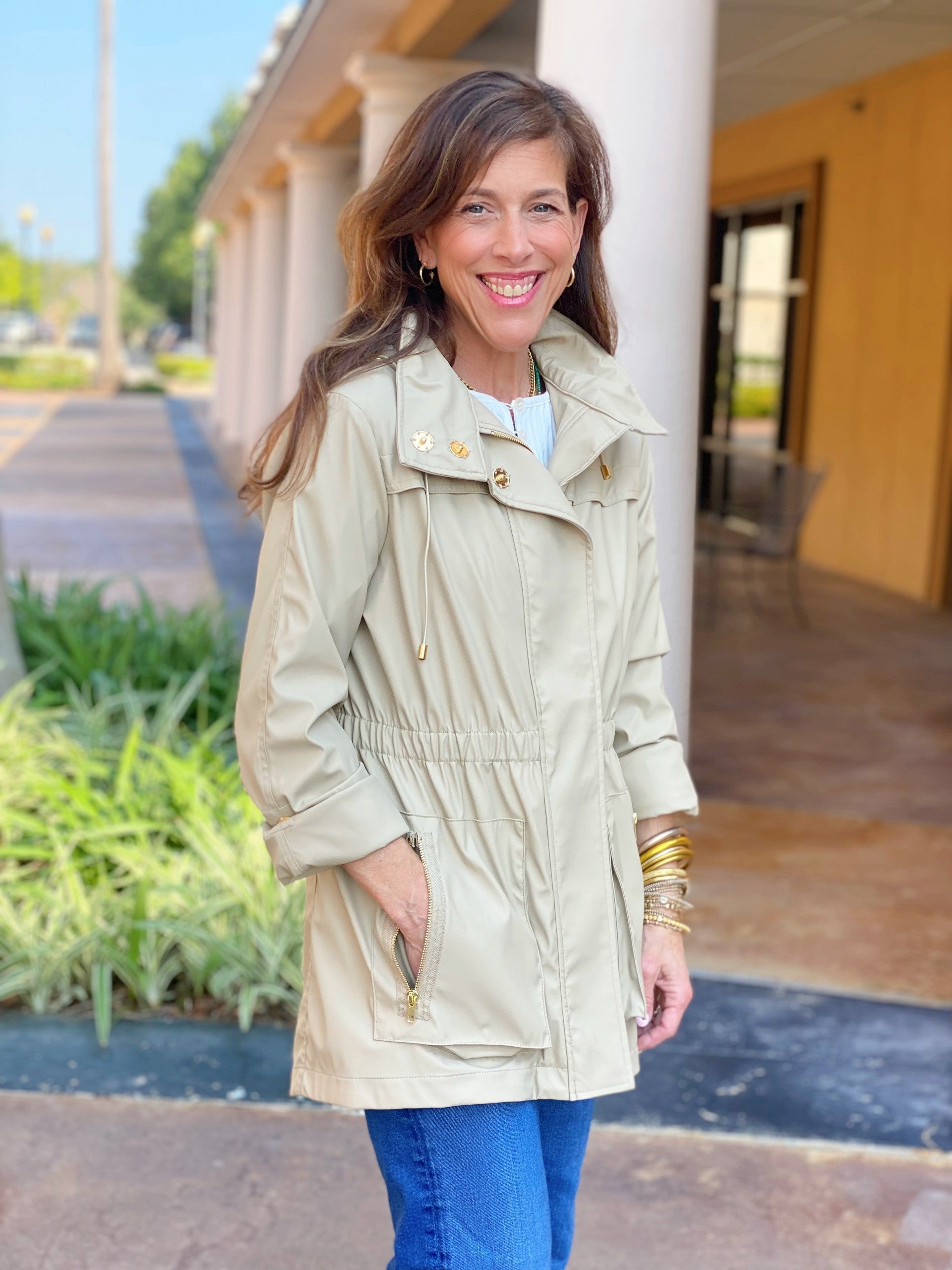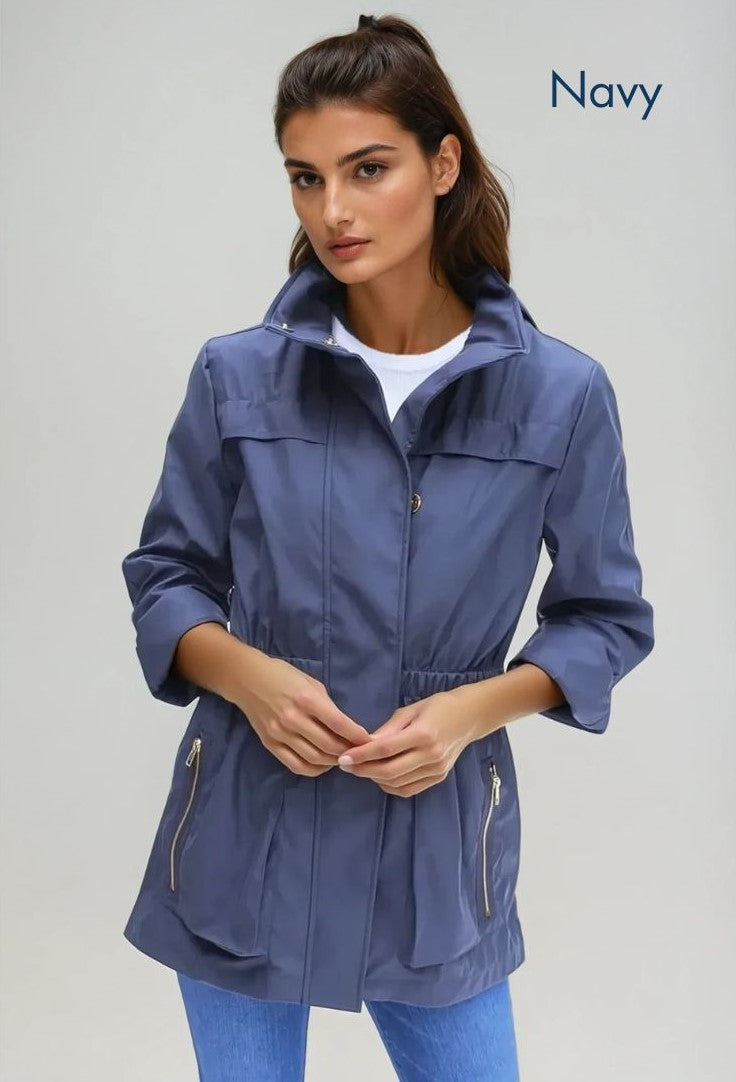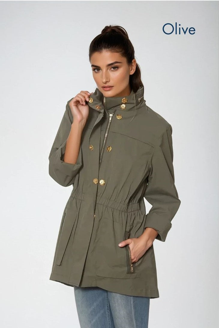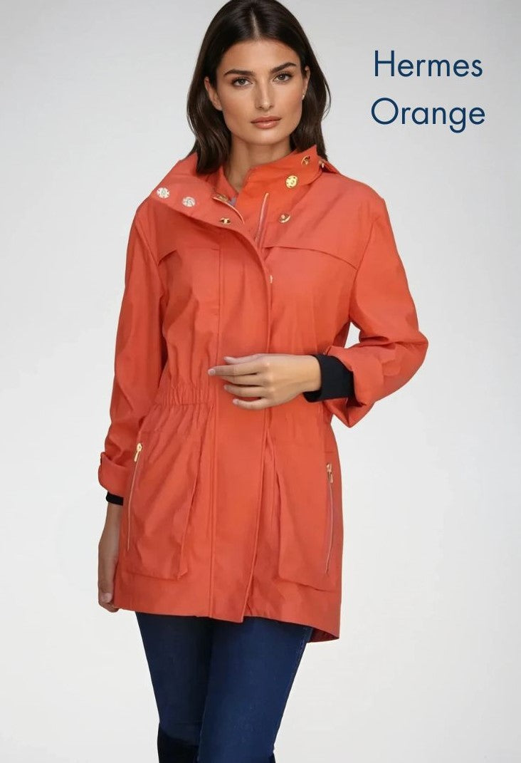 The Anna Jacket is waterproof and wind resistant made in a new fabric developed by Ciao Milano!  It is a soft durable flowing fabric that is not only 100% water proof.  It even has a removable hood that folds up and zips right into the collar!