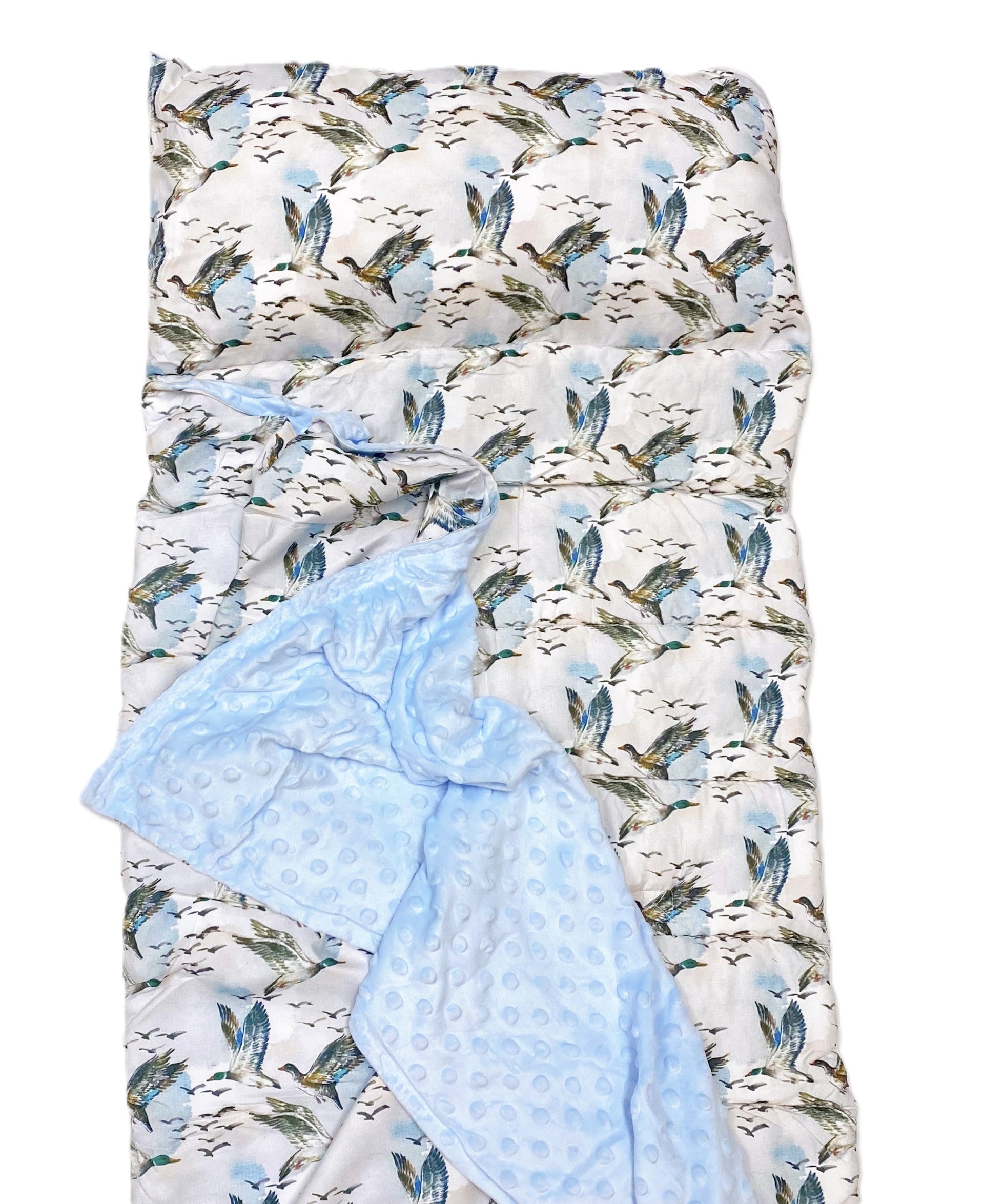 Expertly crafted of oh-so-soft materials, our nap mat is comfy and complete with a built-in pillow. The travel-ready design rolls up and secures for easy carrying, and its playful print adds dreamy color to naptime.