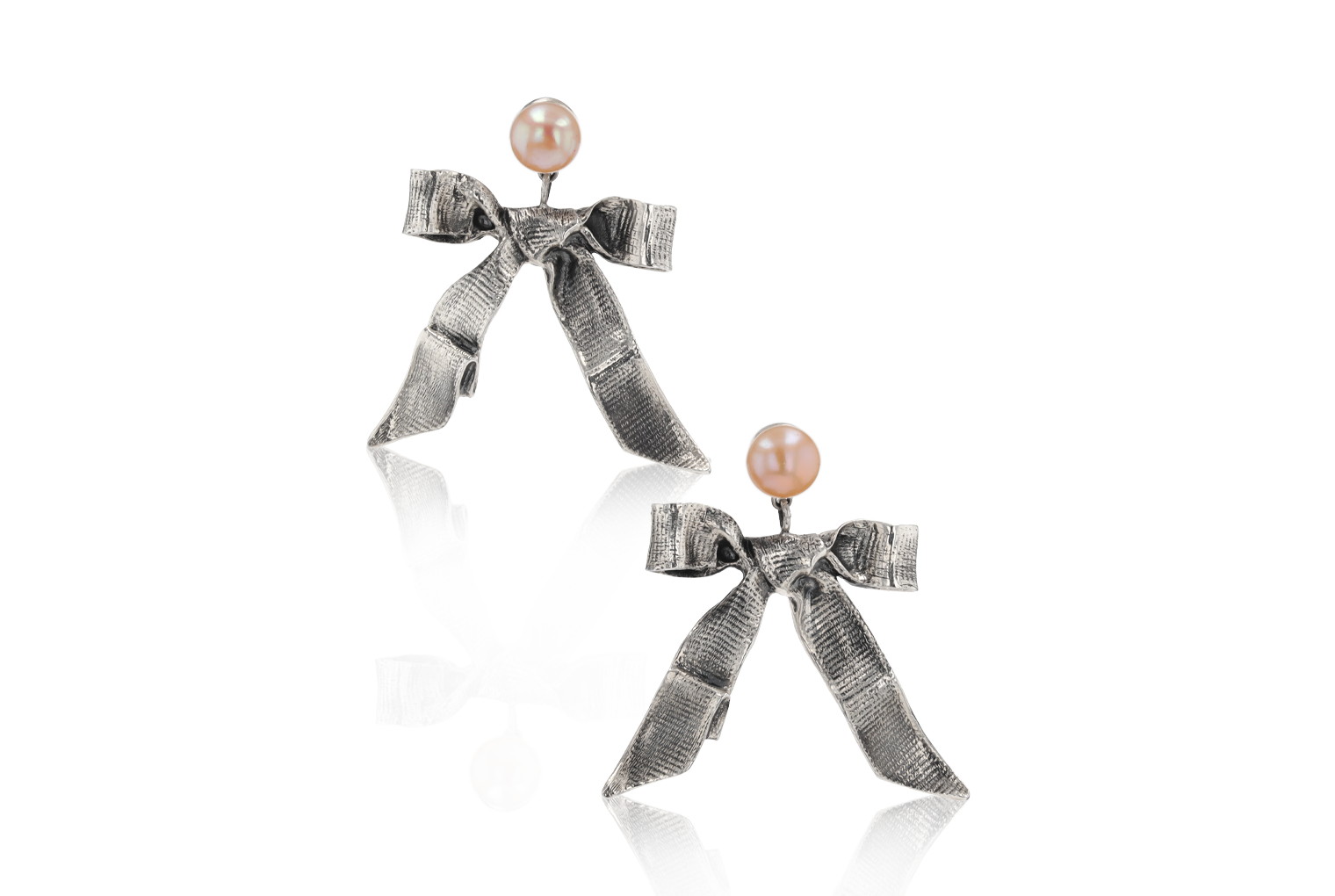 - Statement dangle earrings featuring peach pearls with large ribbon bows.